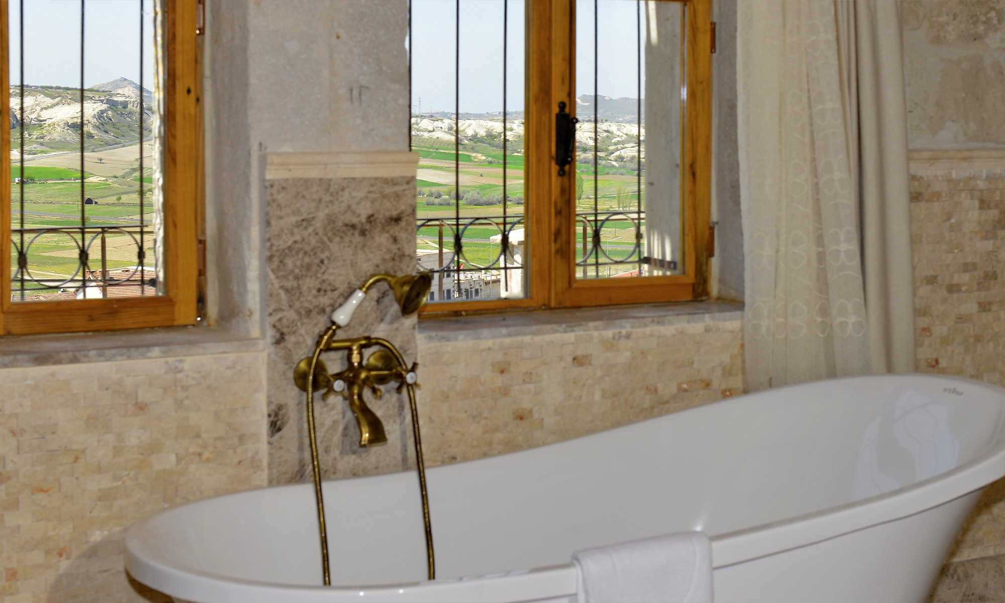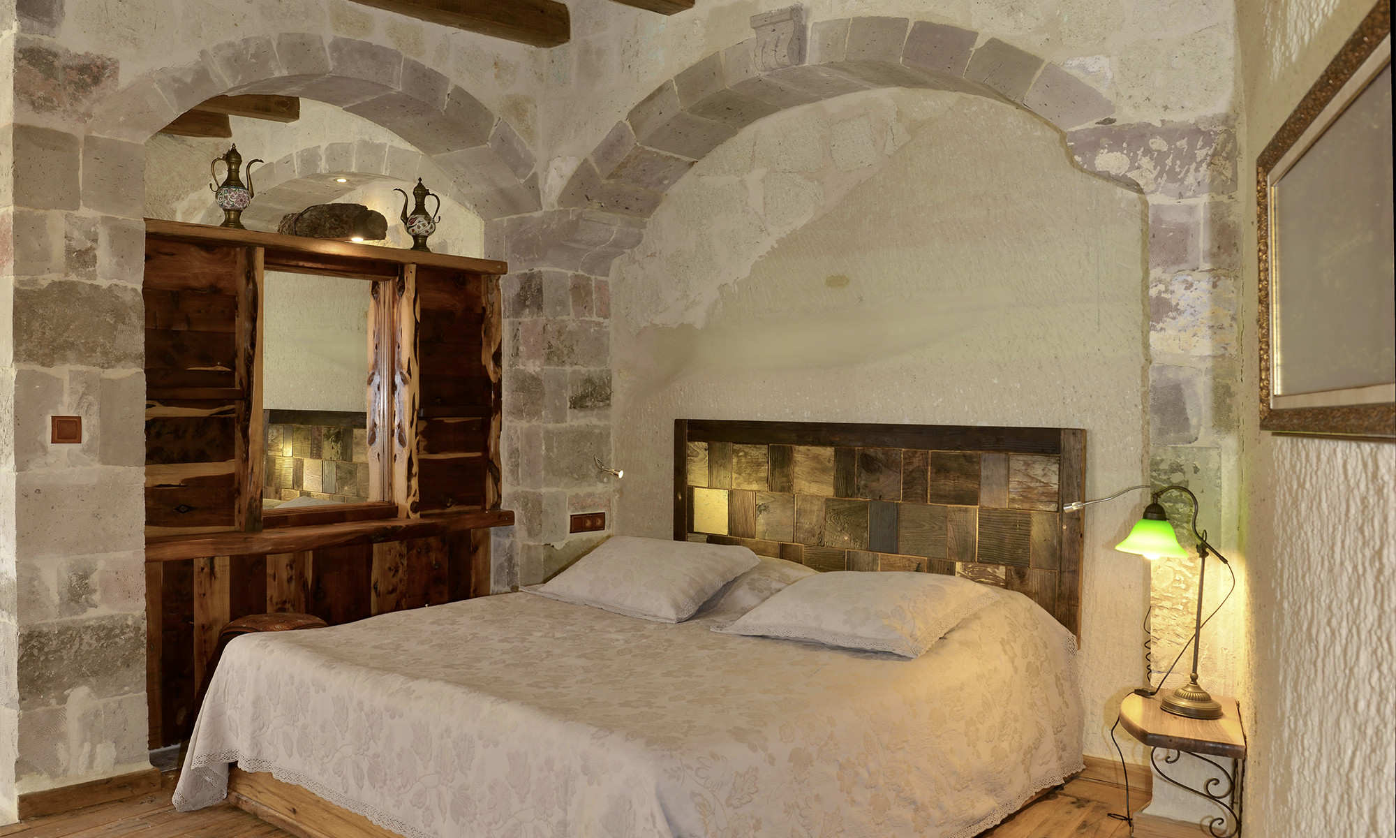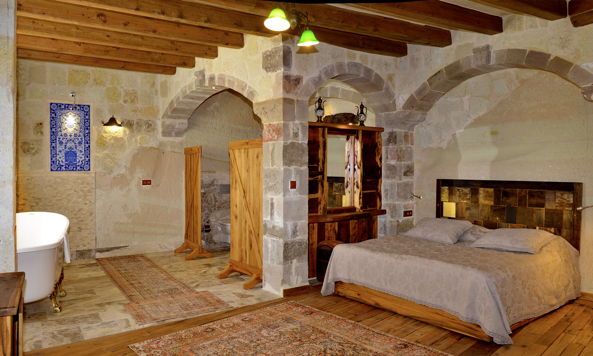 Presidential Suite Local Tufa Stone French Bed/ Super King Size (180cm x 200cm- 67in x 79 in) Private Balcony View of the Cavusin Town in Cappadocia and hot air balloons.