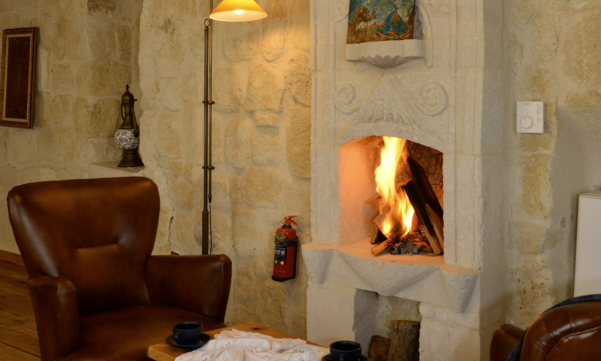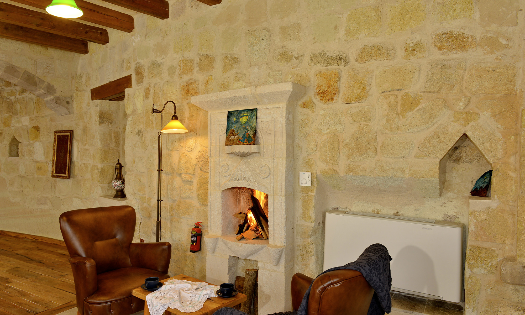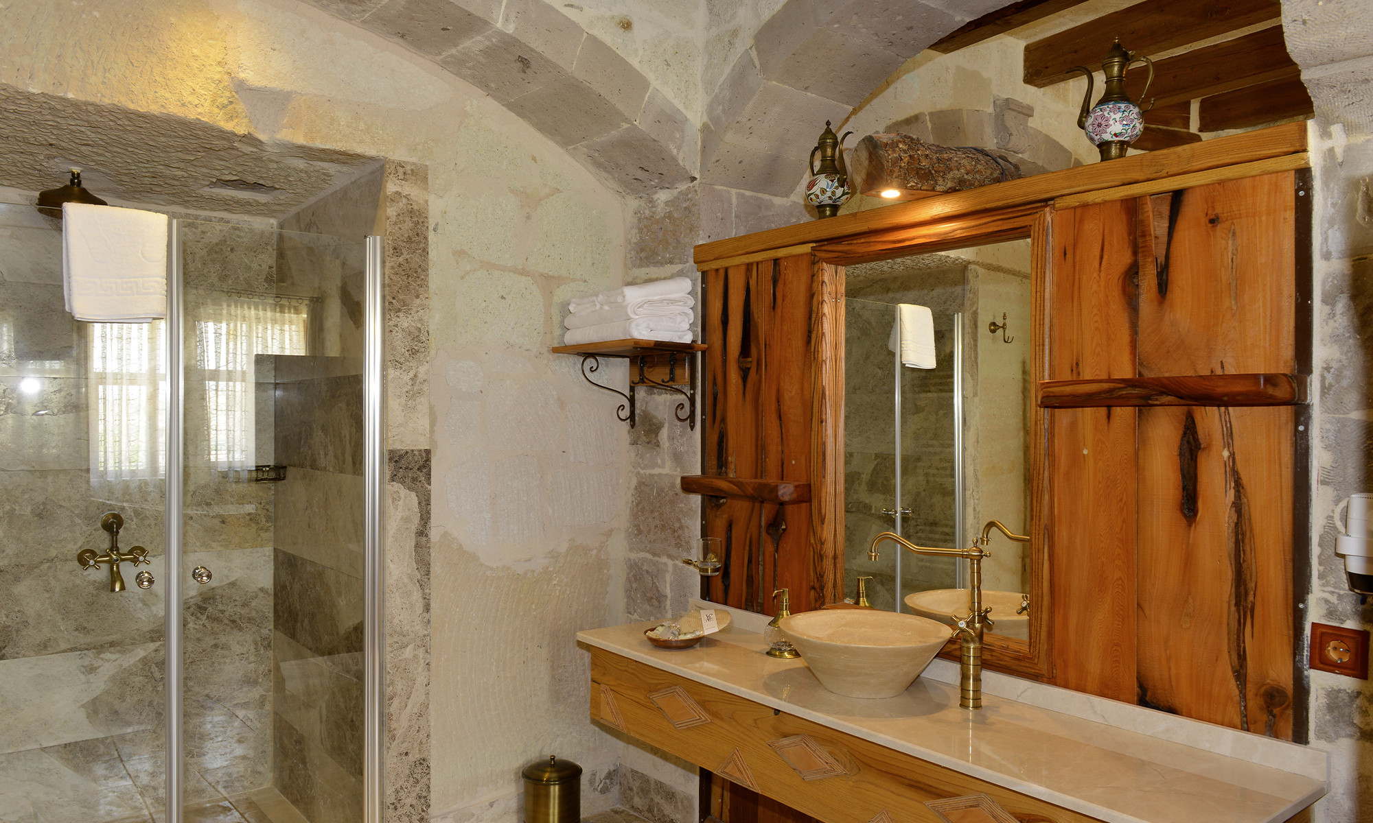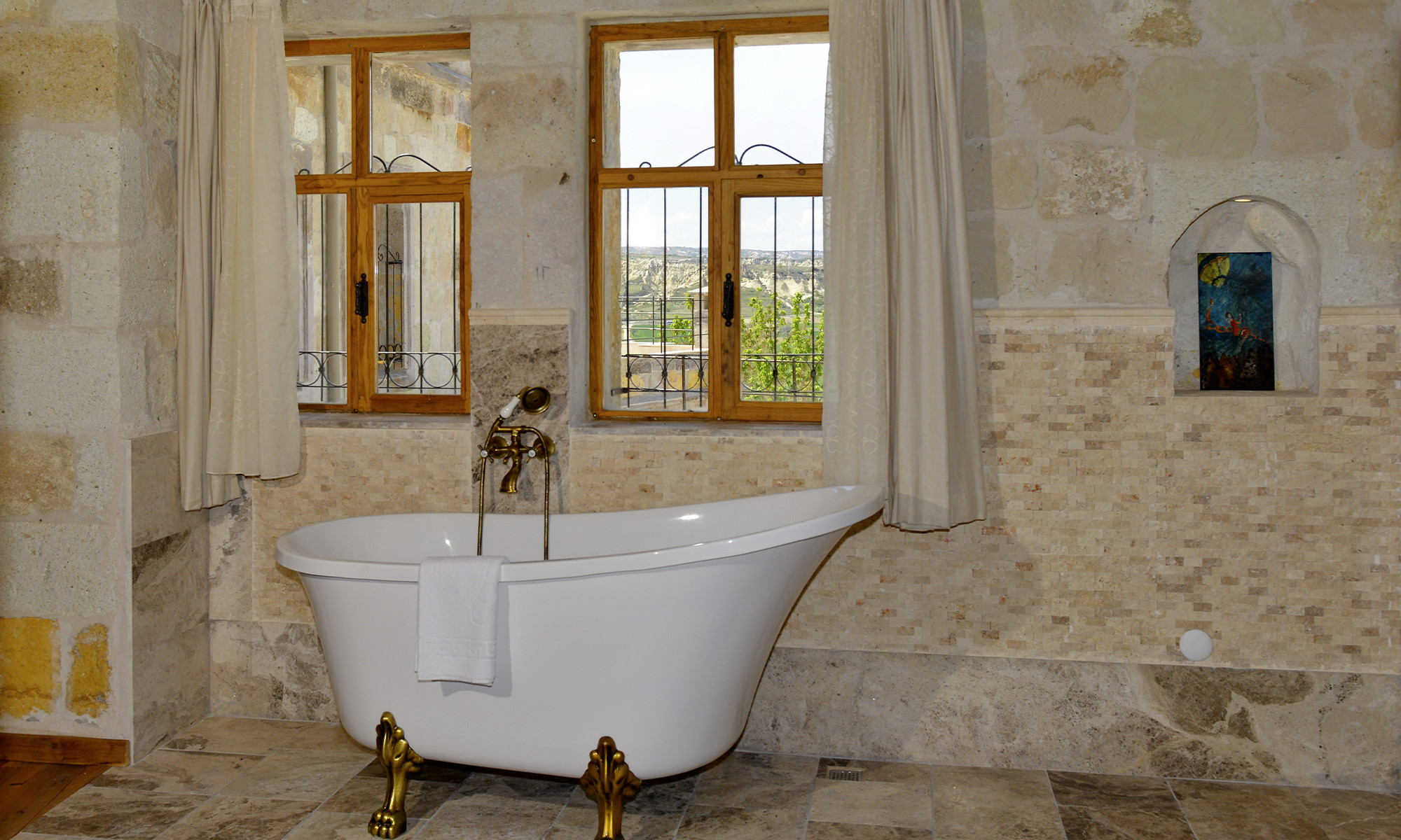 Presidential Suite Local Tufa Stone French Bed/ Super King Size (180cm x 200cm- 67in x 79 in) Private Balcony View of the Cavusin Town in Cappadocia and hot air balloons.